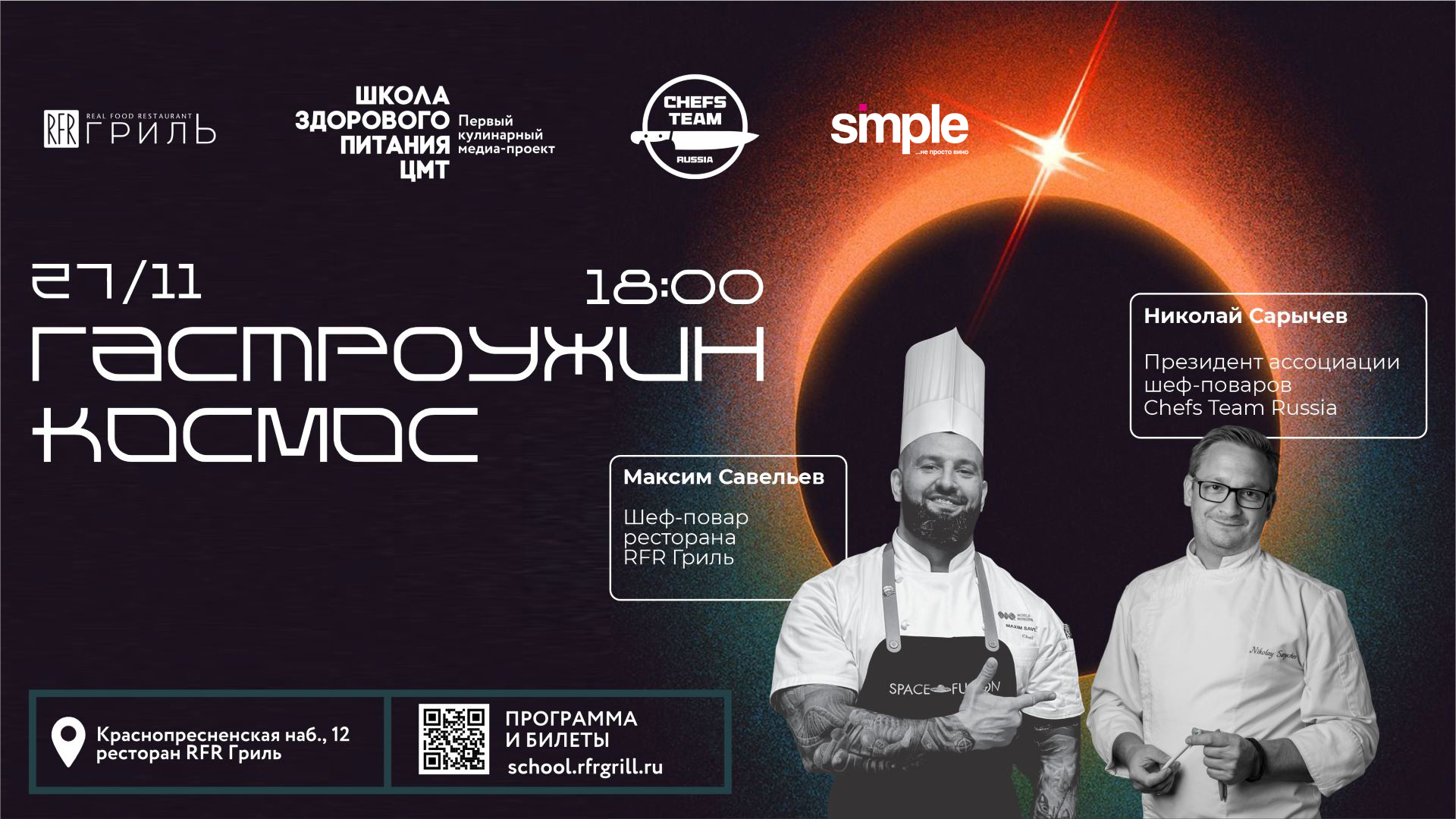 27 ноября в 18:00 ресторан RFR Гриль приглашает на гастрономический ужин «КОСМОС» от двух шефов НИКОЛАЯ САРЫЧЕВА (Президент Ассоциации шеф-поваров Chefs Team Russia) и МАКСИМА САВЕЛЬЕВА (RFR Гриль).