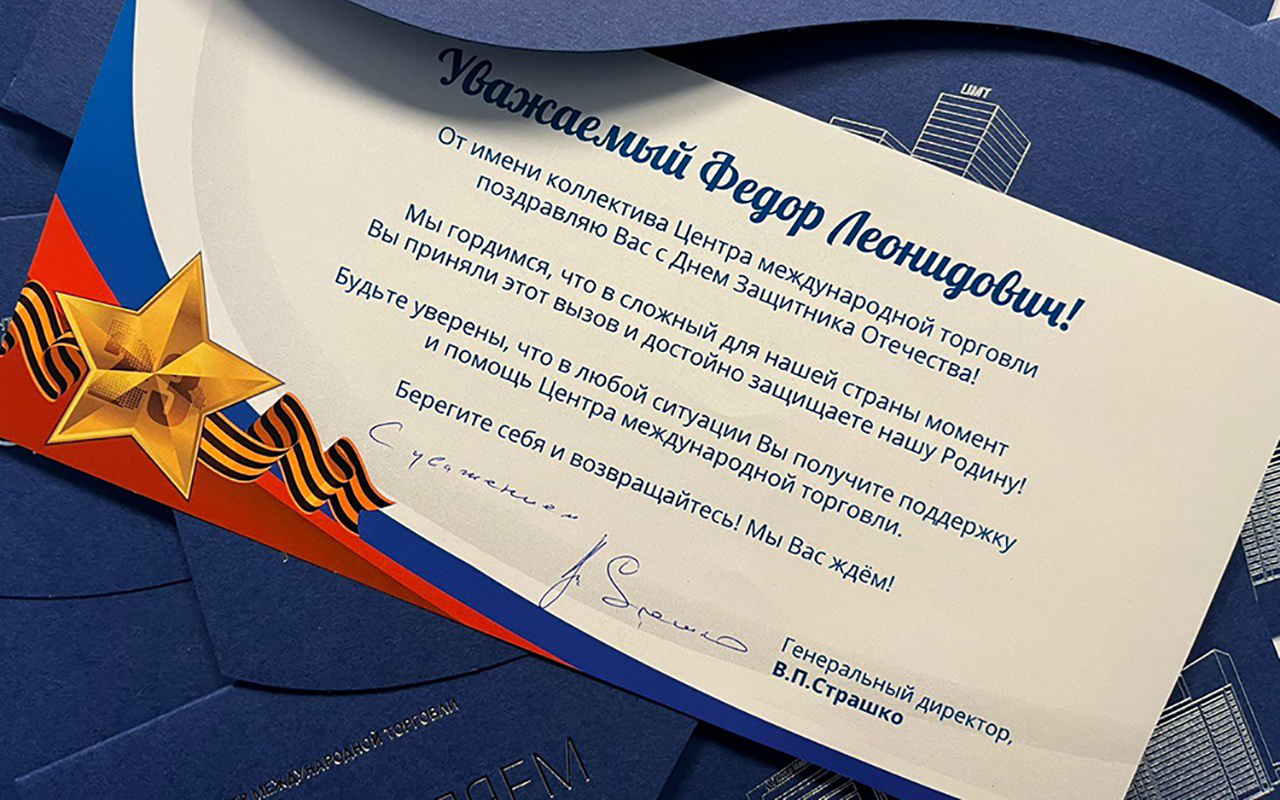 В важный для каждого гражданина нашей страны праздник, 23 февраля, который сейчас приобрел особое значение, Центр международной торговли решил по – особому поздравить своих сотрудников, призванных в ряды Вооруженных Сил РФ для участия в Специальной военной операции на Украине.