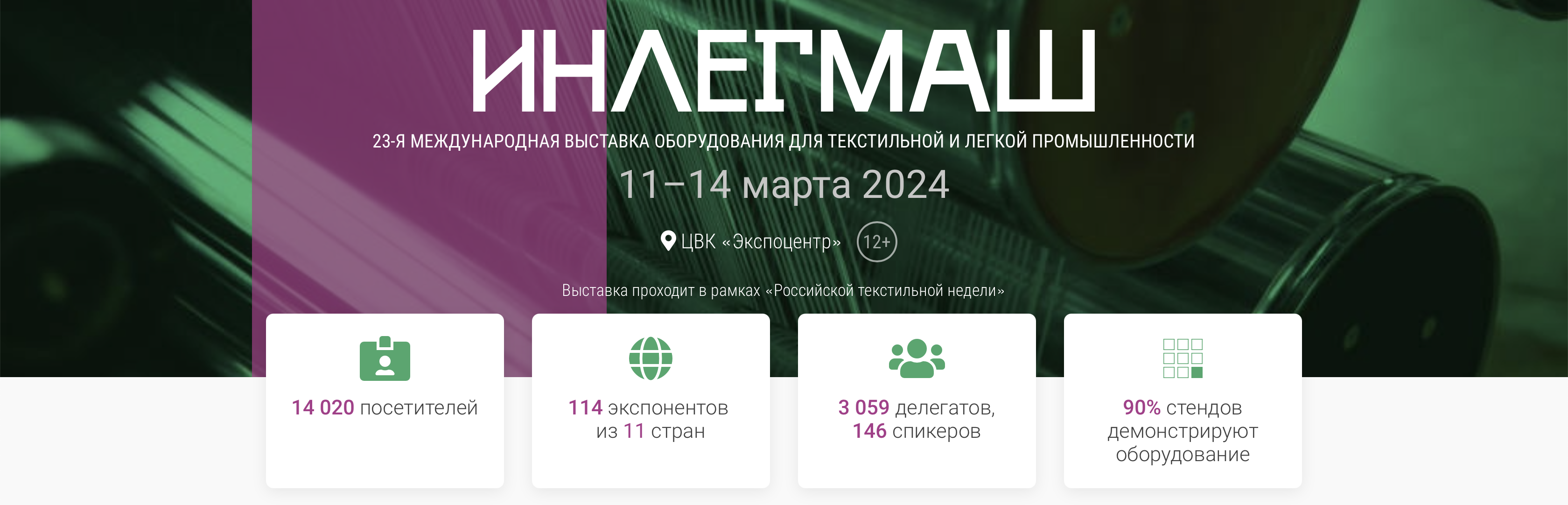 Инлегмаш-2024 проходит в рамках «Российской текстильной недели», в которую также входят Международная выставка тканей и текстильных материалов «Интерткань-2024. Весна», Международная выставка домашнего текстиля и интерьерных решений «Textile & Home-2024. Весна», Международная промышленная конференция «Инлегмаш», а также специализированная экспозиция и Форум по техническому текстилю.