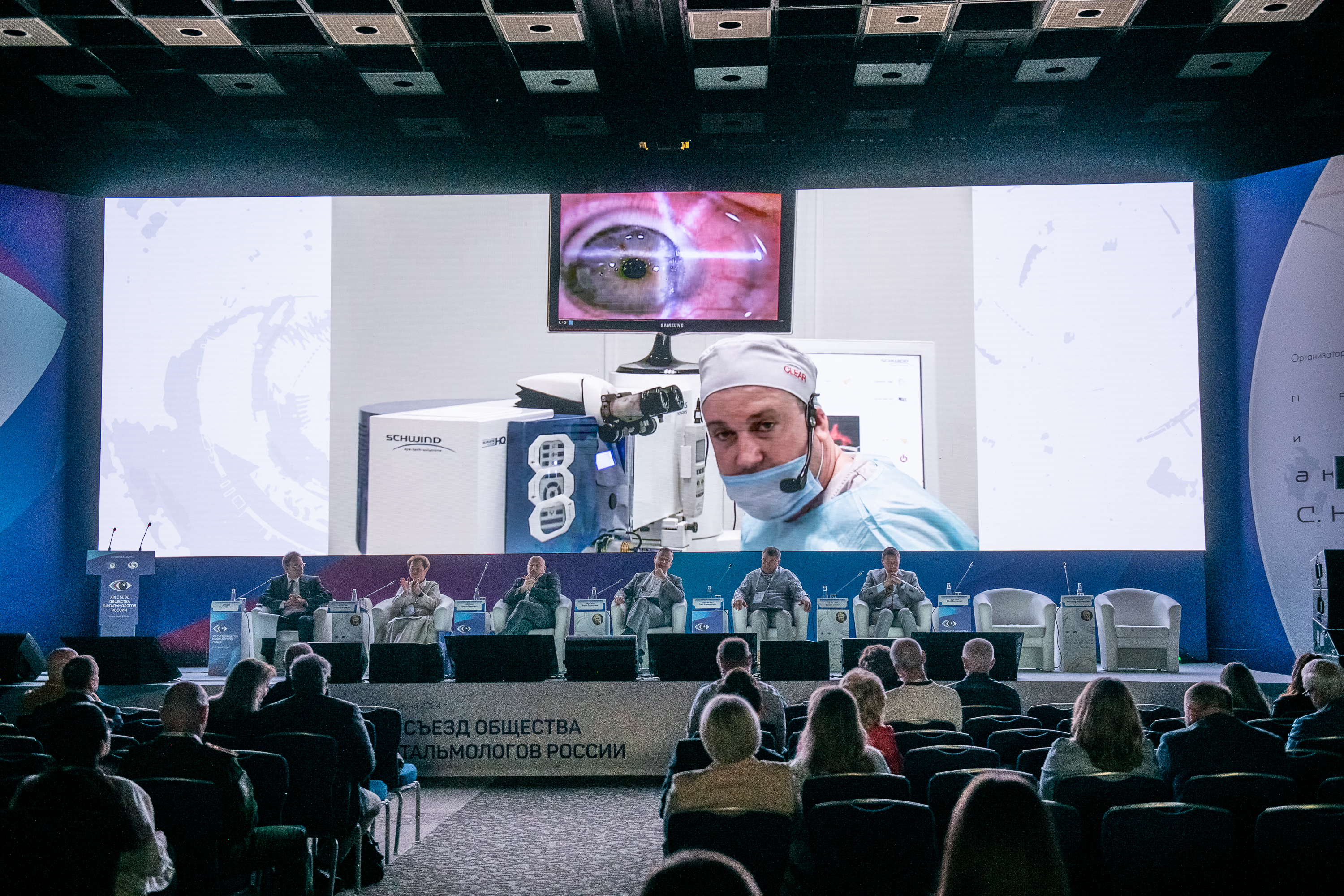 XIII Съезд Общества офтальмологов России открылся с самого утра. На стартовой сессии «Живая хирургия» в главном зале ЦМТ идет онлайн трансляция уникальных глазных операций. Особенность таких операций в том, что врачи могут обмениваться мнениями в ходе проведения операции из любой точки мира. Трансляция, в том числе, предоставляет неоценимый опыт для специалистов. Одну из таких операций в зале, названном на дни мероприятия «Федоров», продемонстрировал участникам мероприятия руководитель Центра офтальмологии ФМА ФГБУ «Государственный научный центр РФ - Федеральный медицинский биофизический центр имени А.И. Бурназяна», д.м.н., профессор Владимир Николаевич Трубилин.