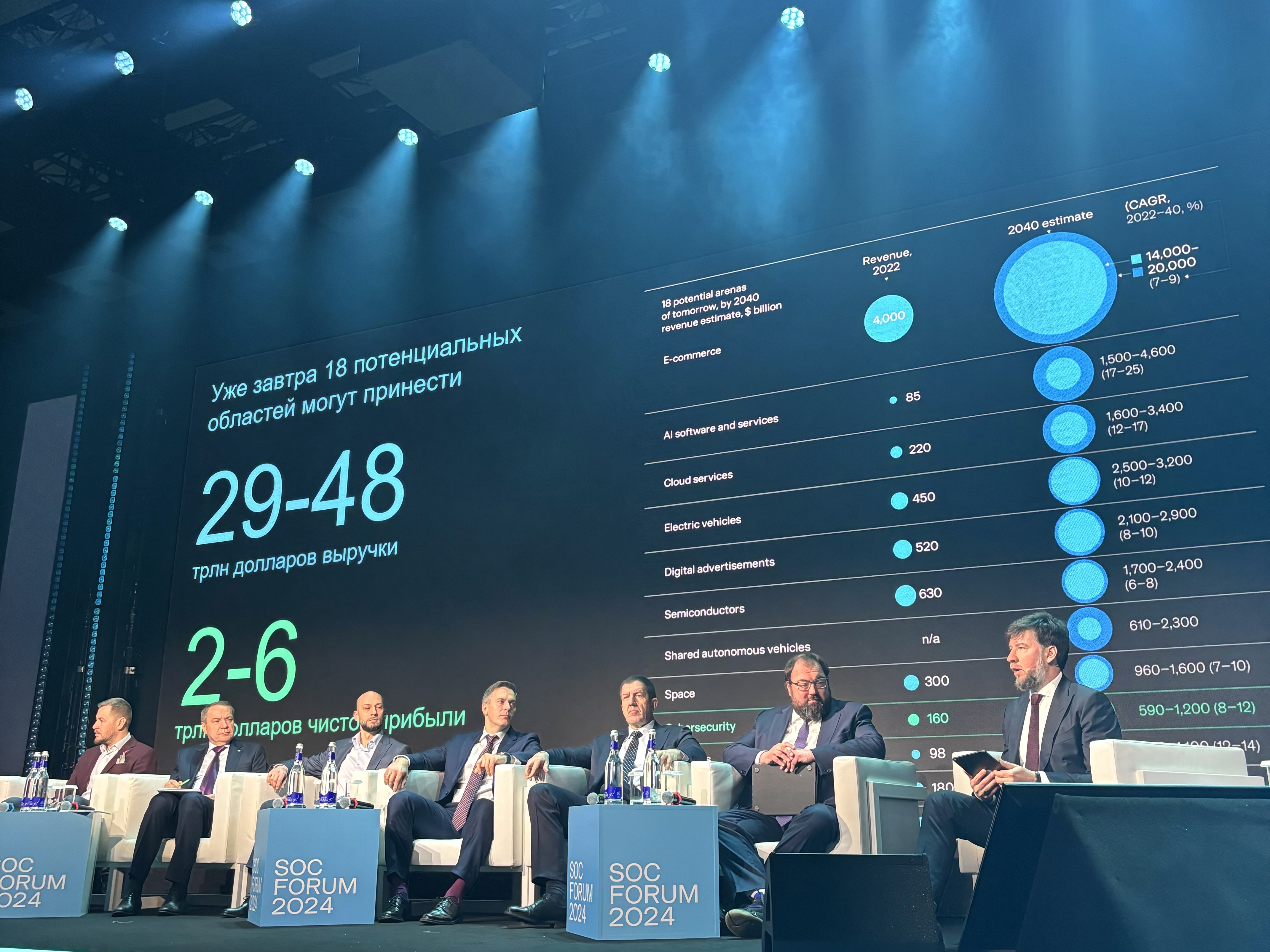 Открывая дискуссию, гендиректор ГК «Солар» Игорь Ляпунов привел в качестве примера исследование McKinsey, опубликованное на днях, в котором компания составила рейтинг новых отраслей, так называемых Big Arenas, до 2040 года (арены - это отрасли, которые преобразуют бизнес-ландшафт, 18 арен могут изменить мировую экономику и принести от 29 до 48 трлн долл. к 2040 году - ред.).