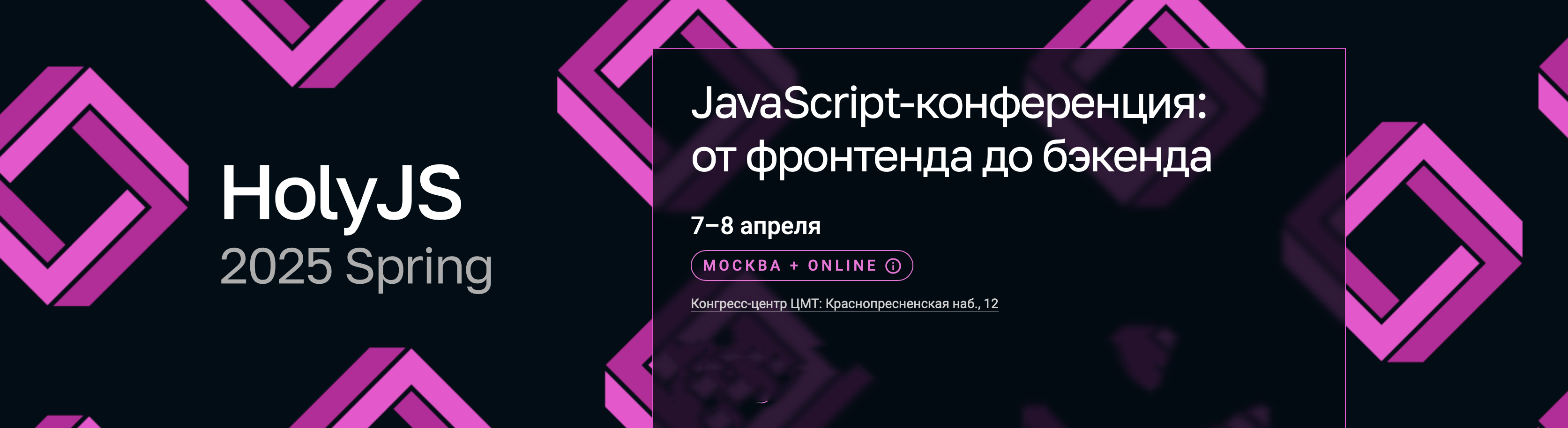 Офлайн программа HolyJS 2025 Spring проходит в Центре международной торговли Москвы 7 и 8 апреля по адресу: Краснопресненская набережная, 12, подъезд 4, Конгресс-центр ЦМТ.