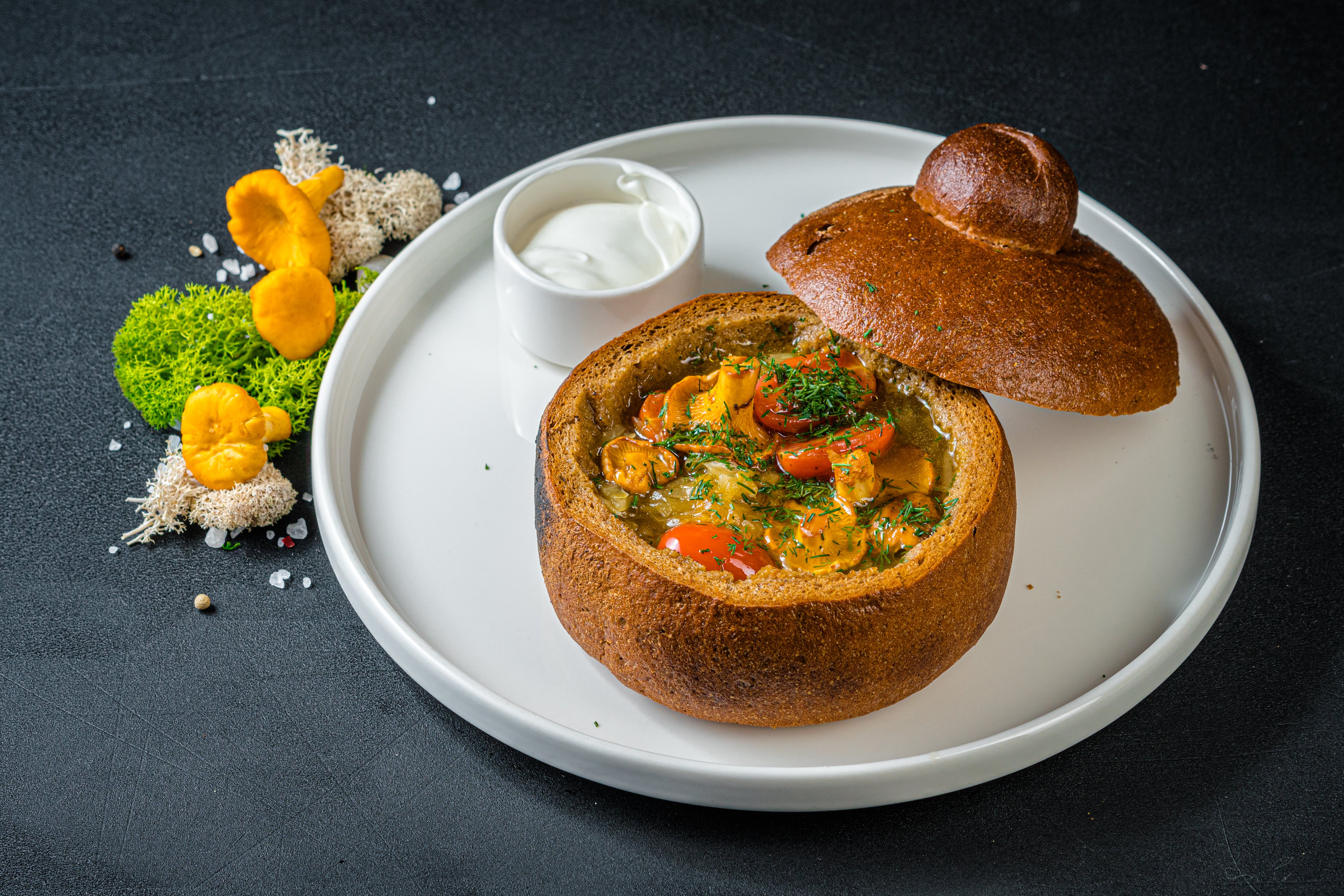 А вот на горячее - очень необычное блюдо - каре ягненка сувид с карельскими лисичками и стейком из краснокочанной капусты. Также это могут быть старорусские щи из квашеной капусты с лисичками, которые подаются в ковриге из бородинского хлеба.