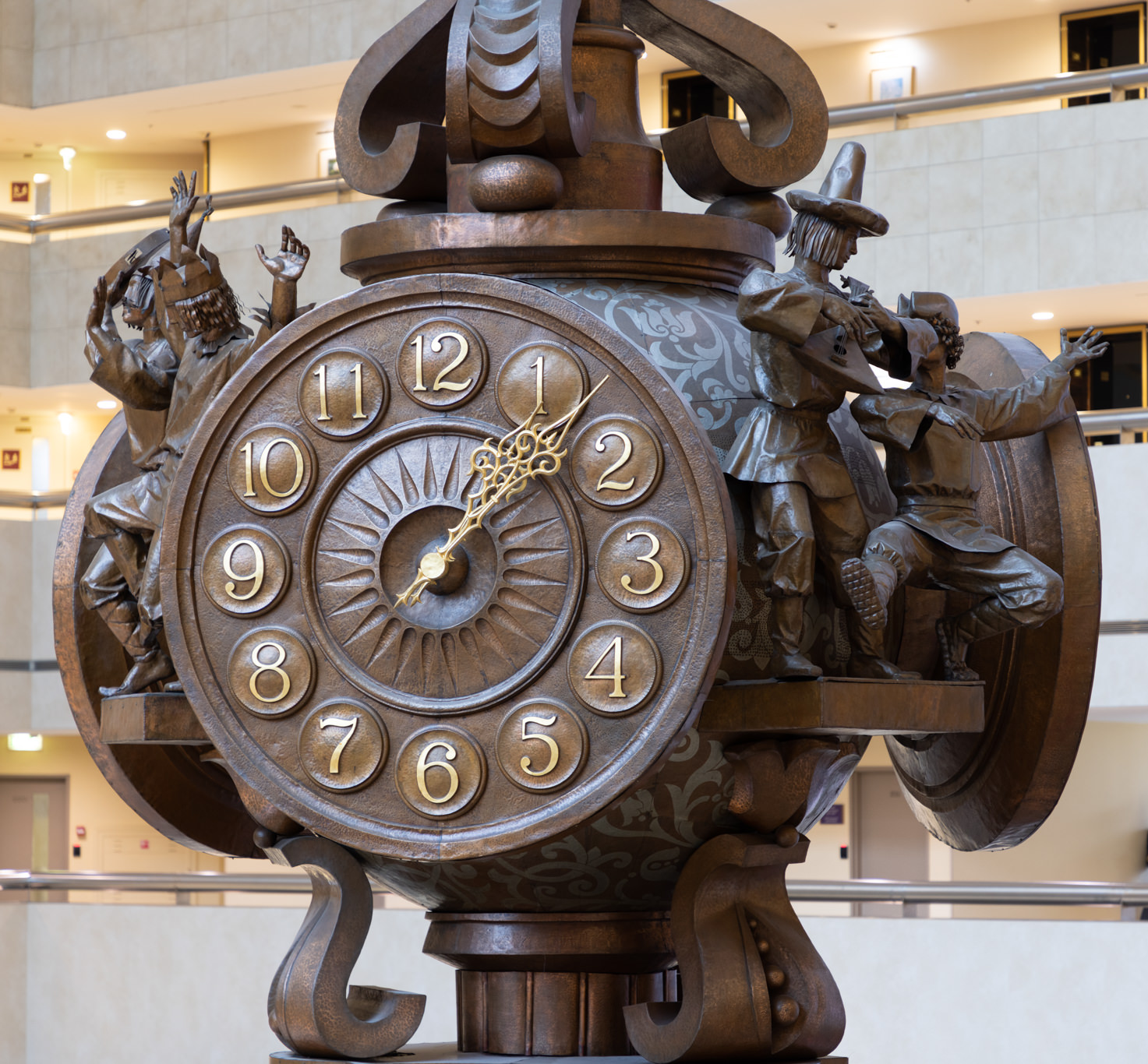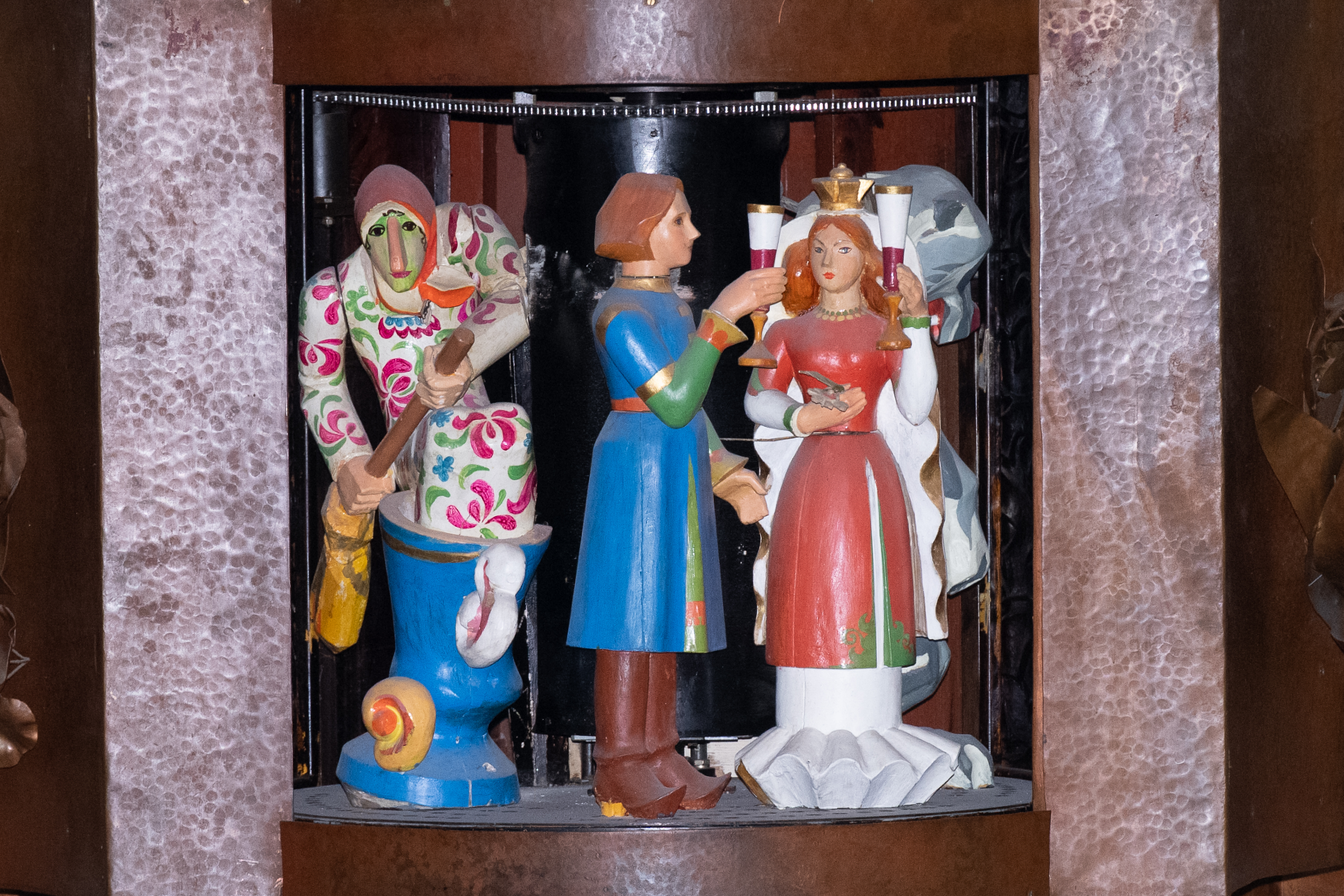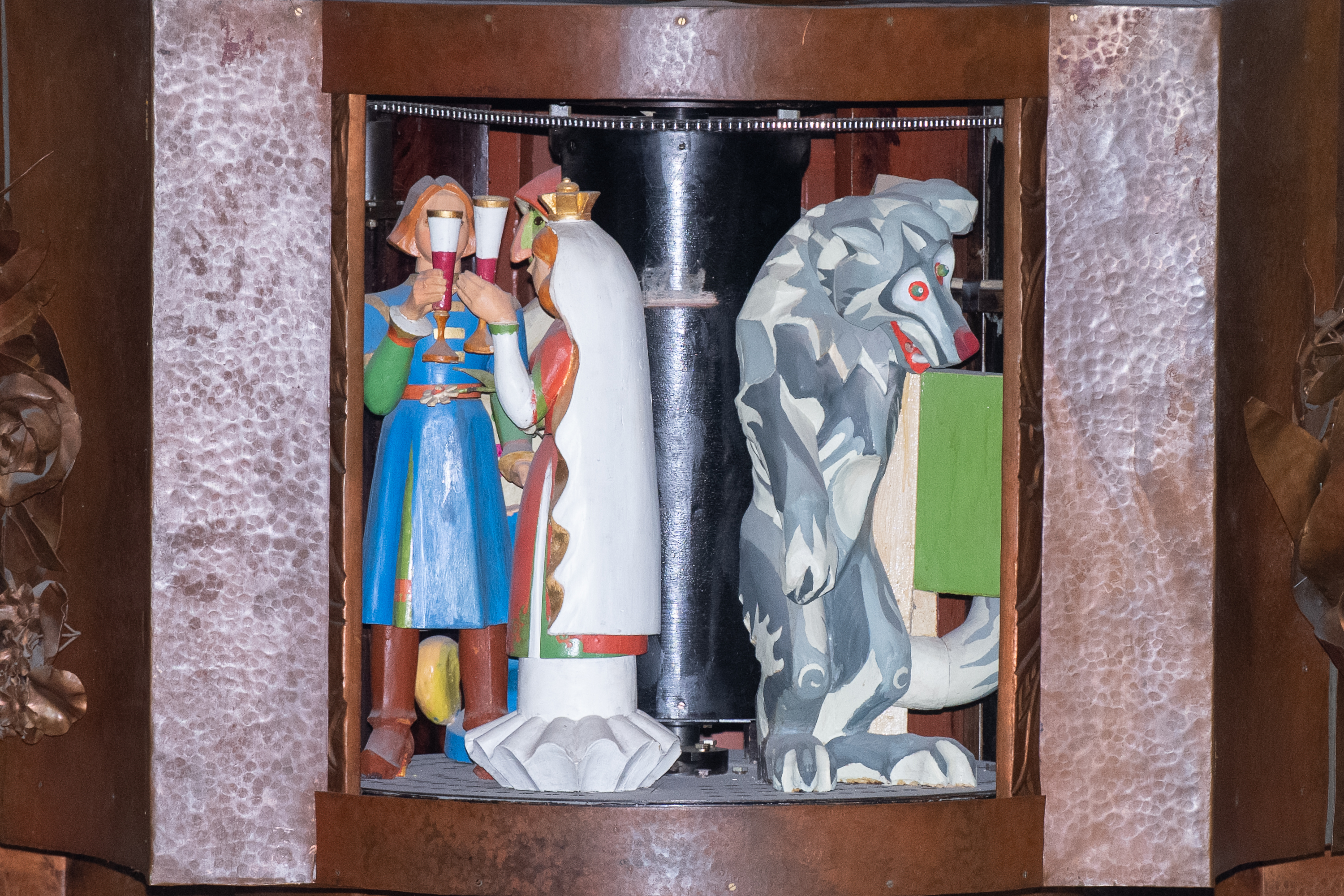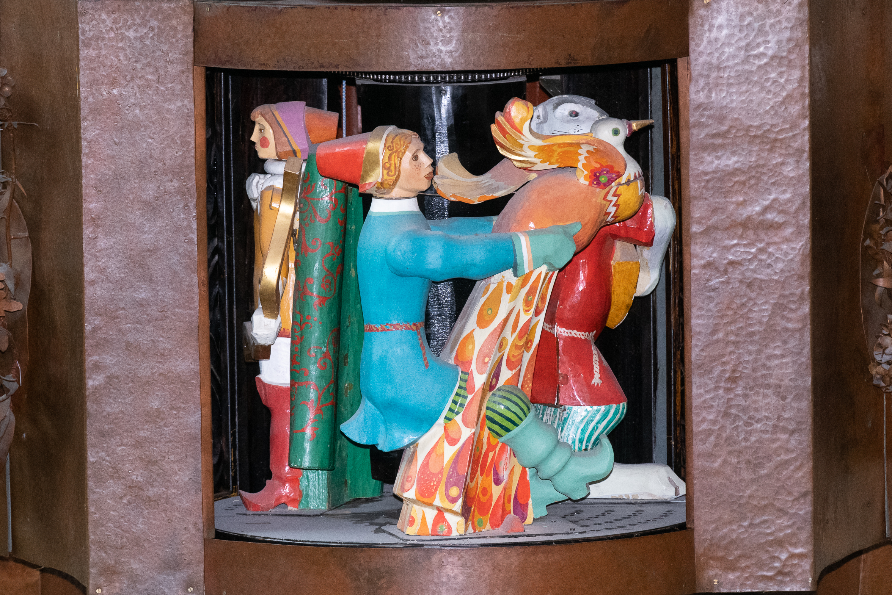 Под часами находится театр русских сказок с двигающимися фигурками, музыкальное сопровождение для которого написала композитор Александра Пахмутова.