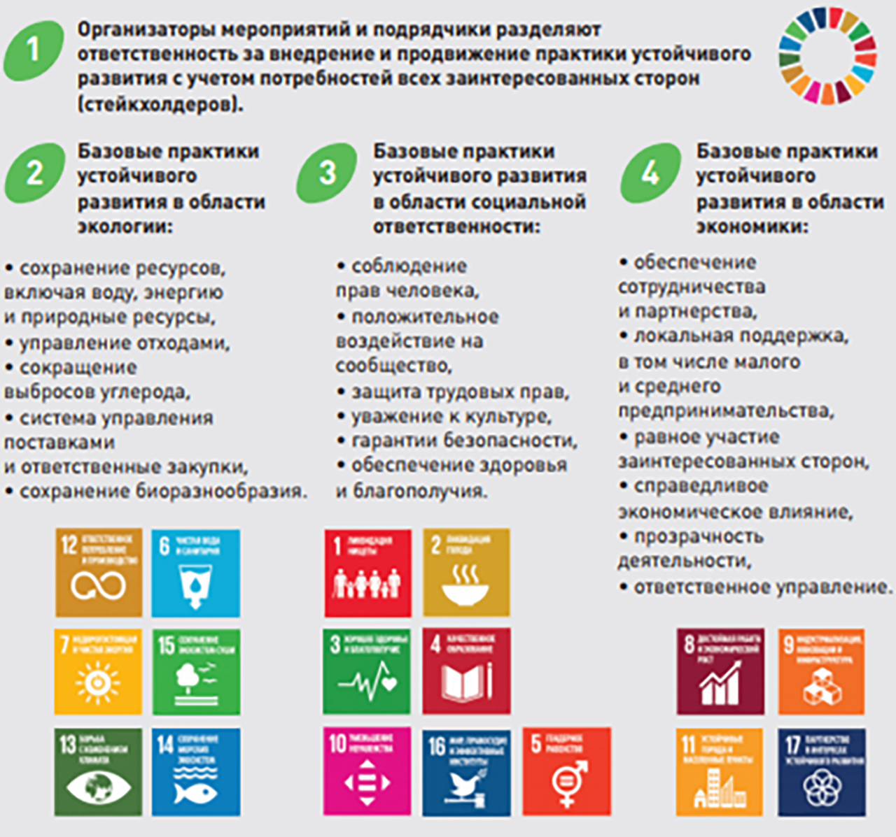 Цель проекта - масштабирование лучших практик на основе передового мирового и российского опыта. На рисунке ниже представлены четыре принципа устойчивого развития в ивент индустрии.