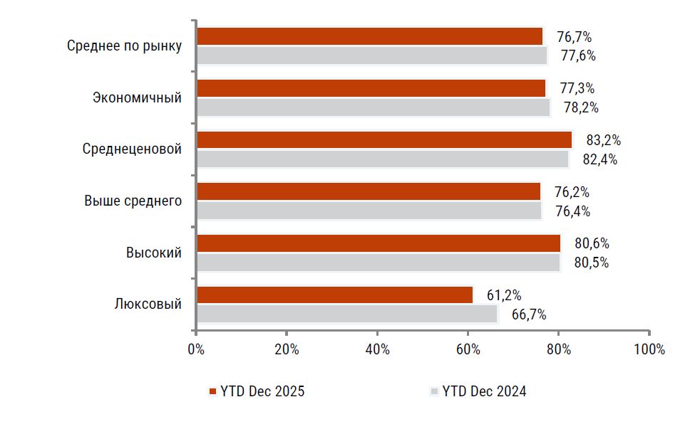 Лидер роста: единственным сегментом, показавшим заметный рост загрузки, стал среднеценовой (+0,8%), достигнув самого высокого показателя на рынке в 83,2%.