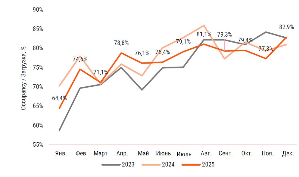 Среднеценовой сегмент демонстрирует самую высокую загрузку, немного превышающую 83%. Люксовый сегмент показывает заметное снижение загрузки в 2025 году (61,2%) по сравнению с 2024 годом (66,7%). Основные выводы: