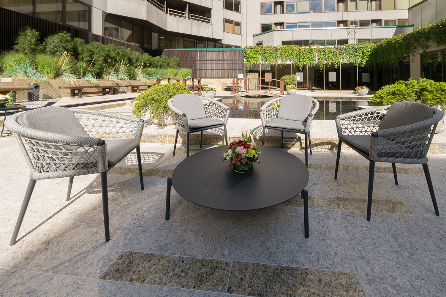 Расположившись внутри офисных зданий открытая летняя площадка – японский дворик ЦМТ – отличается оригинальным дизайном в лаконичном восточном стиле с водными каналами, прудами, мини-водопадами и живыми растениями. Гранитные стены офисных зданий, мраморные дорожки, ступени здесь удачно интегрированы в концепцию японского сада – зеленого островка под открытым небом, в котором, согласно японской культуре, сочетание воды, растений и камней традиционно символизирует океаны, лесные и горные массивы. Сюда, в японский дворик ЦМТ, приятно заглянуть, чтобы на несколько минут вырваться из рабочей рутины, вдохнуть свежий уличный воздух и перекусить. Группы с удобными креслами и невысокими столиками, а также деревянные скамейки по периметру позволяют выбрать подходящий формат для отдыха или делового общения.