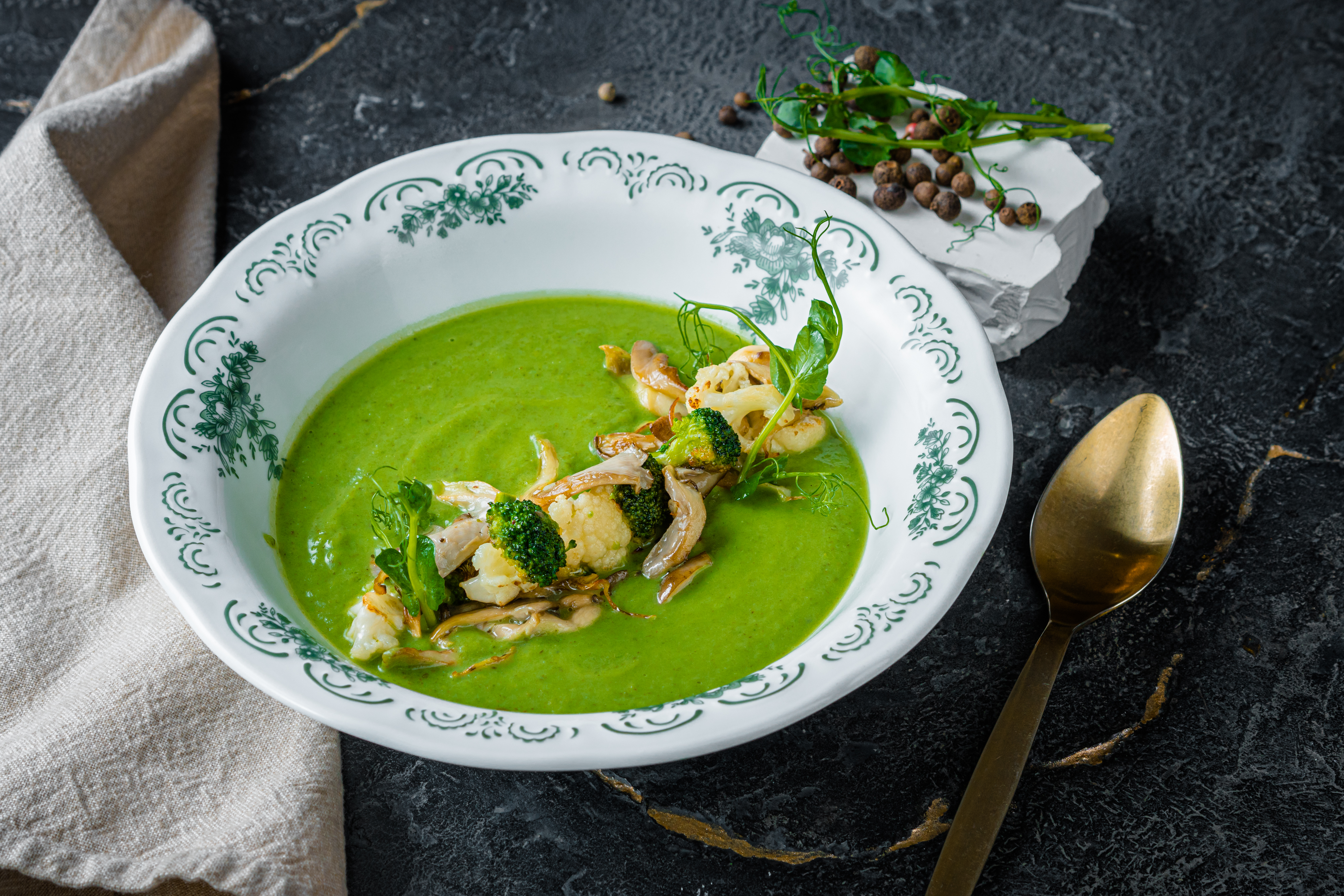 К обеду предлагается постный крем-суп из брокколи и цветной капусты с вешенками, борщ с белыми грибами, суп-пюре из печеной тыквы и груши.
